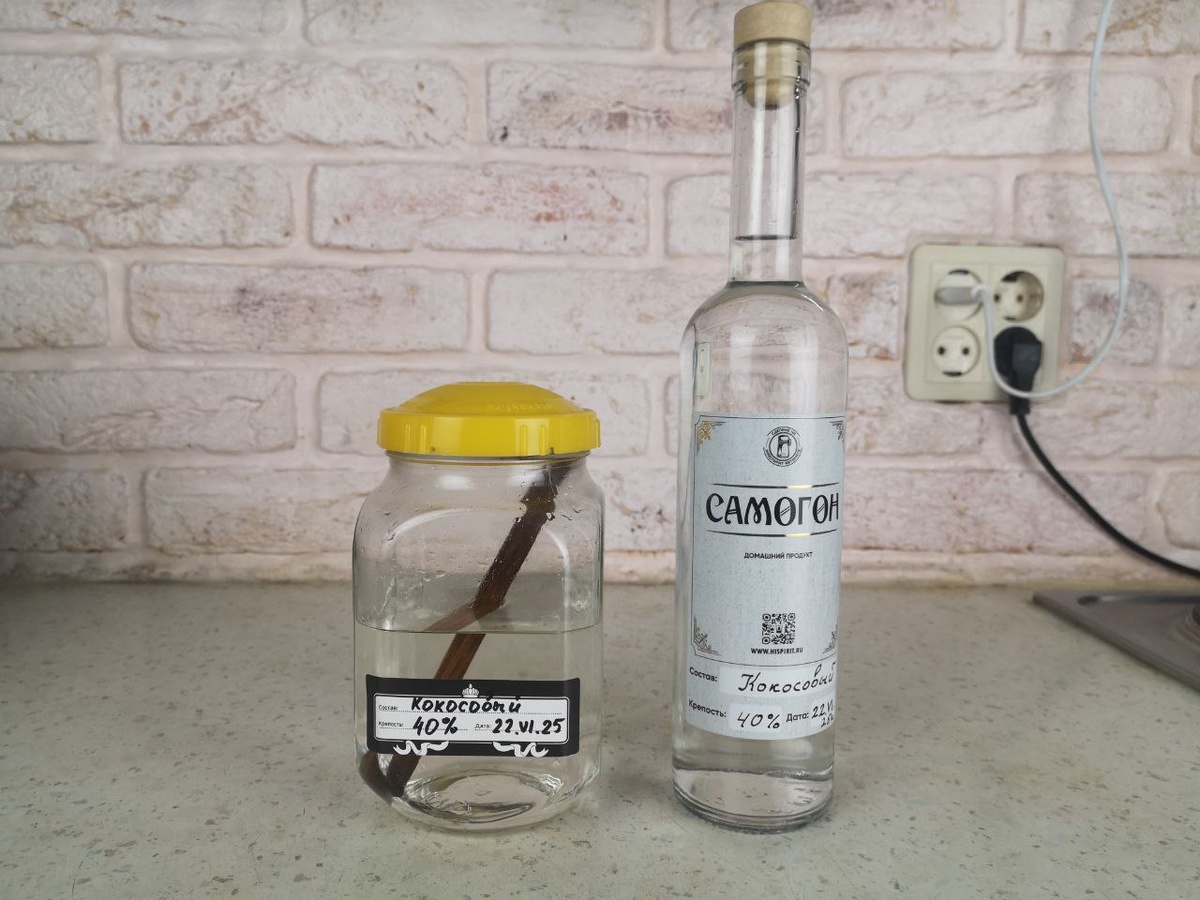 После разбавления водой до 40% получил 1,3 литра кокосово-пальмового дистиллята. И тут стоит рассказать о предварительном вкусо-ароматическом профиле. Ничего общего с брагой не было и в помине! Аромат был очень яркий, крепкий, ореховый. То ли жареный фундук, то ли наконец-то кокос, то ли жареная семечка, но никакой карамельной шоколадности уже не было. Признаться, запах фрустрировал своей неоднозначностью.