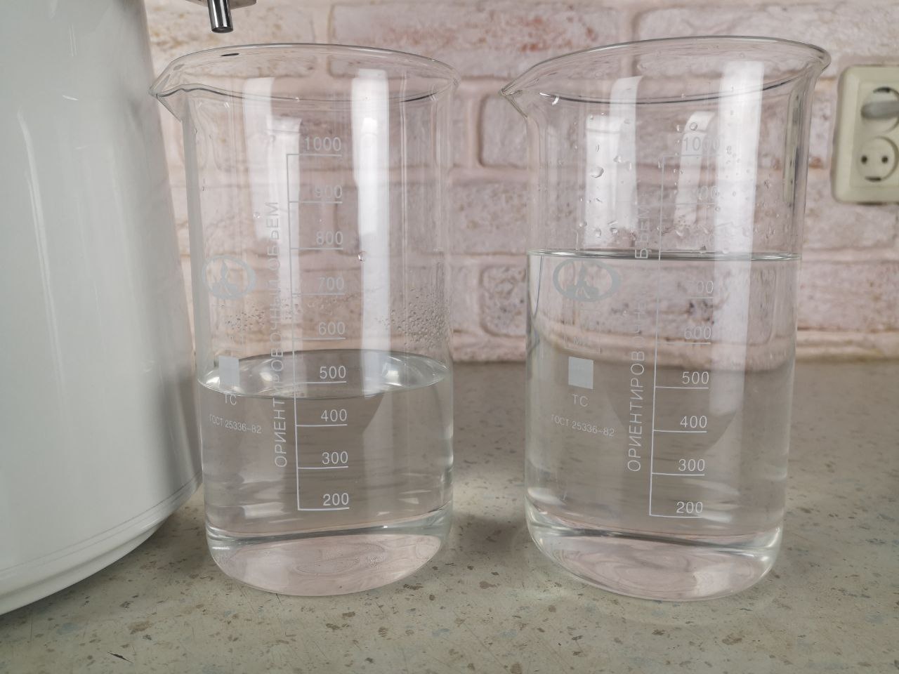 Тело-2 (низкоспиртуозный дистиллят) и тело-1 (отбор до 40% в струе) заботливо собраны по стаканам.