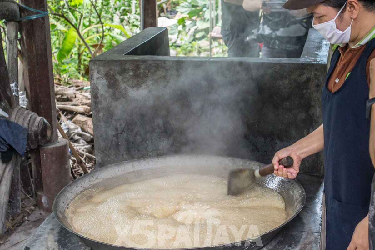 Для получения сахара молодые ветви пальмы связывают в пучки и надрезают, собирая сладкий нектар (почти что наш березовый сок!). Работа опасная, так как соконосные соцветия располагаются на высоте 30-40 метров. Затем нектар несколько раз упаривают, получая сироп, после чего кристаллизуют. Вот такой продукт мы и решили перегнать.